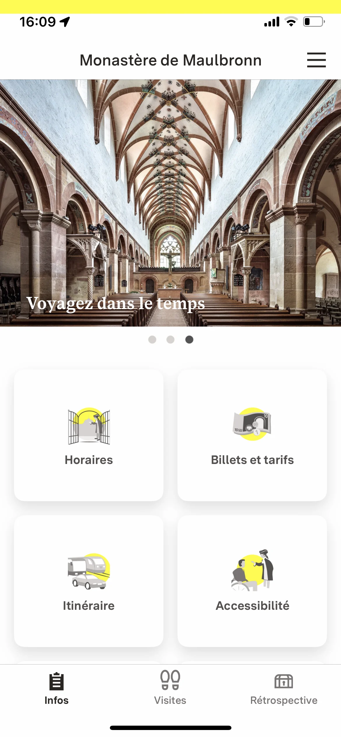 L'application « Monument BW » est téléchargeable gratuitement dans les magasins d’applications courants. Elle propose des visites guidées et des informations sur les châteaux, les monastères, les jardins et les joyaux du Land. Les visites guidées peuvent être téléchargées et utilisées hors ligne. Une visite découverte comprend environ 20 stations avec des niveaux d'approfondissement et dure environ 1 heure et demie, selon la taille du monument et votre rythme. Les visites découvertes pour adultes sont proposées en allemand et en anglais, et pour certains monuments également en français et dans d'autres langues.