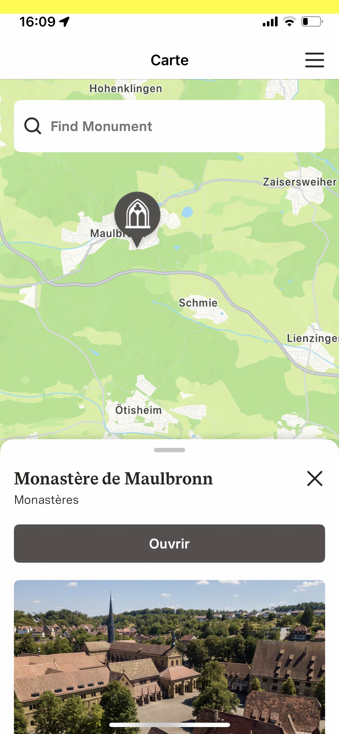 La carte et la fonction de recherche permettent de trouver rapidement le monument souhaité et de l'ouvrir. Vous disposerez alors de toutes les informations utiles pour votre visite. Vous pouvez ensuite télécharger la visite guidée.